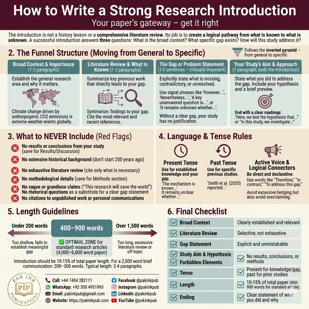 A strong introduction follows an inverted pyramid, moving from general to specific. It should contain four essential elements. 1) Broad Context & Importance (1-2 paragraphs): Establish the general research area, why it matters, and who cares. Example: “Climate change driven by anthropogenic CO2 emissions is intensifying extreme weather events globally.” 2) Literature Review & What Is Known (1-2 paragraphs): Summarize key previous work, but only that which directly leads to your gap. Do not list every paper; synthesize findings. Cite the most relevant and recent references. 3) The Gap or Problem Statement (1-2 sentences, critically important): Clearly and explicitly state what is missing, contradictory, or unresolved. Use signal phrases like “However…”, “Nevertheless…”, “A key unanswered question is…”, or “It remains unknown whether…” This is the hinge of your entire introduction. Without a clear gap, your study has no justification. 4) Your Study’s Aim & Approach (1 paragraph, usually ending the introduction): State what you did to address the gap. Include your hypothesis (if applicable) and a brief preview of your approach or key findings. End with a clear roadmap sentence like “Here, we test the hypothesis that…” or “In this study, we investigate…” Do not leave the reader guessing.