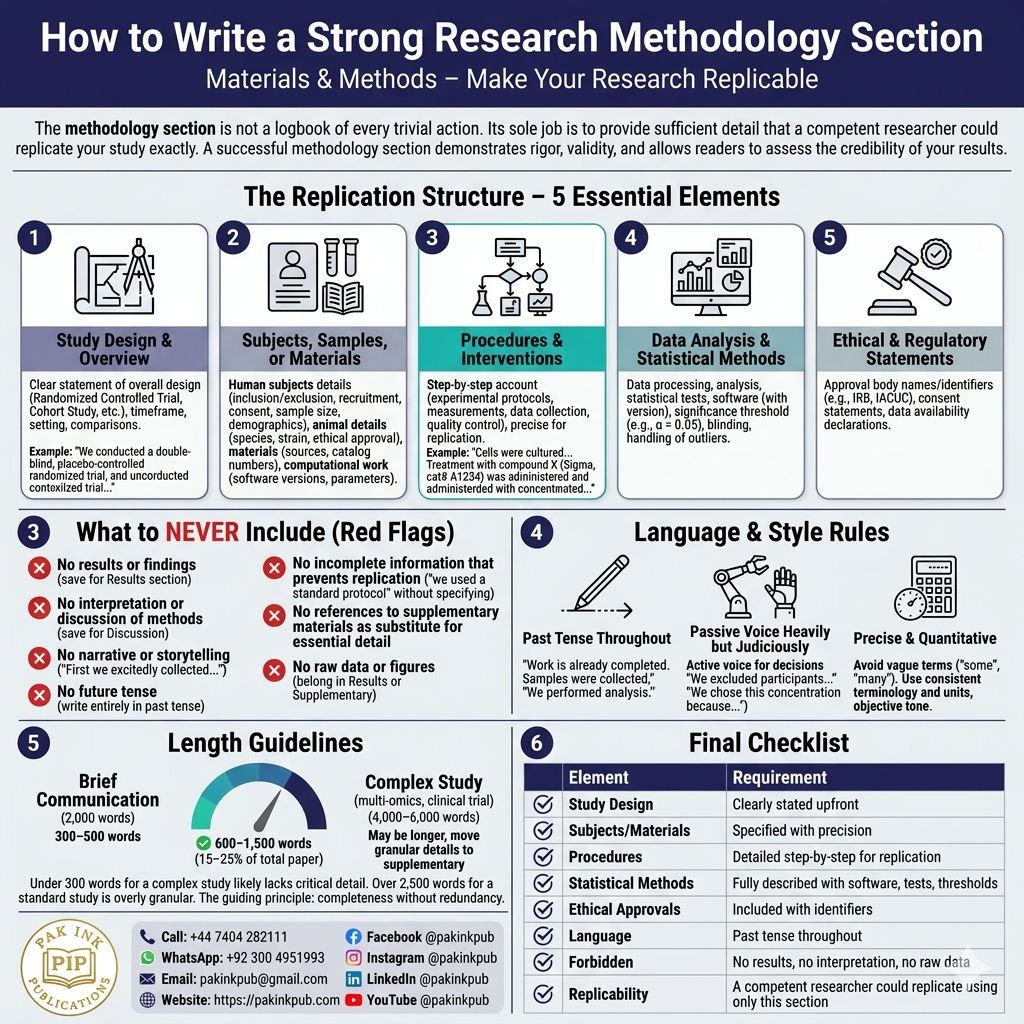 A strong methodology section is organized logically, typically following the flow of the study or grouped by technique. It should contain five essential elements. 1) Study Design & Overview (1-2 paragraphs): Begin with a clear statement of the overall design. Is it a randomized controlled trial? A cohort study? A qualitative interview study? A computational model? State the timeframe, setting, and key comparisons. Example: “We conducted a double-blind, placebo-controlled randomized trial with parallel assignment over 12 weeks at three tertiary care centers.” 2) Subjects, Samples, or Materials (1-2 paragraphs): Describe exactly what was studied. For human subjects: inclusion and exclusion criteria, recruitment methods, consent procedures, sample size justification (power analysis), and demographic summary. For animals: species, strain, sex, age, housing conditions, ethical approval. For materials: sources, catalog numbers, preparation methods. For computational work: software versions, parameters, data sources, code availability. 3) Procedures & Interventions (2-4 paragraphs): Provide a step-by-step account of what you did, in chronological or logical order. Detail experimental protocols, interventions, measurements, data collection methods, and quality control procedures. Be precise enough for replication. Example: “Cells were cultured in DMEM supplemented with 10% FBS at 37°C with 5% CO2. Treatment with compound X (Sigma, cat# A1234) was administered at concentrations of 1, 10, and 100 µM for 24 hours.” 4) Data Analysis & Statistical Methods (1-2 paragraphs): Describe exactly how data were processed, analyzed, and interpreted. State the statistical tests used, software (with version), significance threshold (e.g., α = 0.05), adjustments for multiple comparisons, handling of outliers, and any transformations or normalizations. Include who was blinded and how. 5) Ethical & Regulatory Statements (brief, often separate): For human or animal research, include approval body names and identifiers (e.g., IRB, IACUC), consent statements, and declarations of data availability or preregistration where applicable.