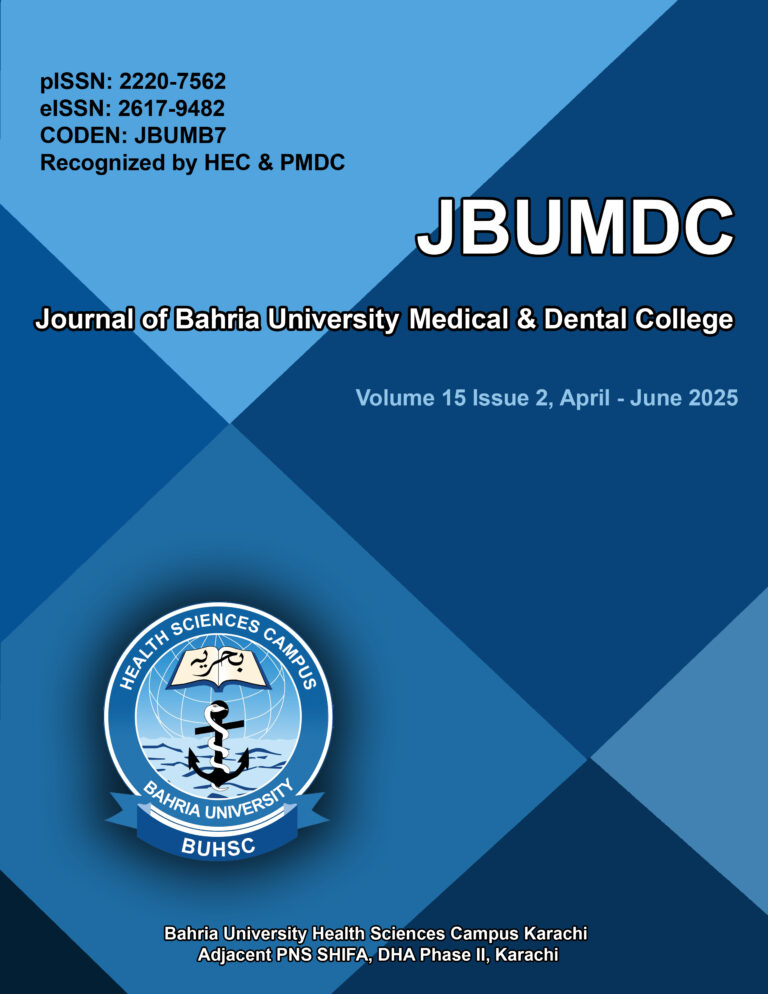 The Journal of Bahria University Medical and Dental College (JBUMDC) is a peer-reviewed, multidisciplinary biomedical journal focusing on both basic and clinical health sciences (Print ISSN: 2220-7562; Online ISSN: 2617-9482; CODEN: JBUMB7). Established in 2011, JBUMDC aims to promote and disseminate high-quality research within the healthcare research community. The journal is published quarterly in January, April, July, and October. It is recognized by the Pakistan Medical and Dental Council (PM&DC) under IP/0072 and by the Higher Education Commission (HEC) of Pakistan.