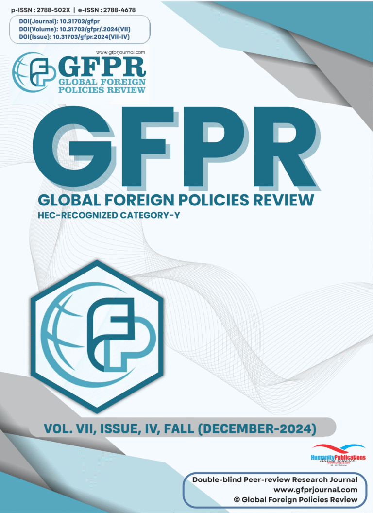 Global Foreign Policies Review (GFPR) is a quarterly, double-blind peer-reviewed, multi-disciplinary research journal published by Humanity Publications, a prominent research and analytics publishing house in Pakistan. Dedicated to advancing knowledge for the betterment of society, GFPR seeks to address societal challenges and foster global human development by encouraging high-quality research. The journal welcomes both qualitative and quantitative studies employing diverse methodologies such as experiments, interviews, observations, analyses, and surveys. GFPR covers a wide spectrum of the Social Sciences, with a particular emphasis on Government & Politics, Human & Society, Historical & Regional Studies, and Education & Mass Studies. It serves as a platform for scholars, academics, and researchers to disseminate impactful findings across multiple disciplines, contributing to informed global discourse and policy-making.